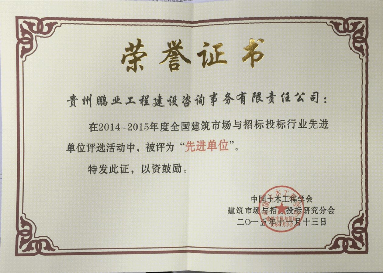 獲得2014-2015年度全國建筑市場與招標投標
